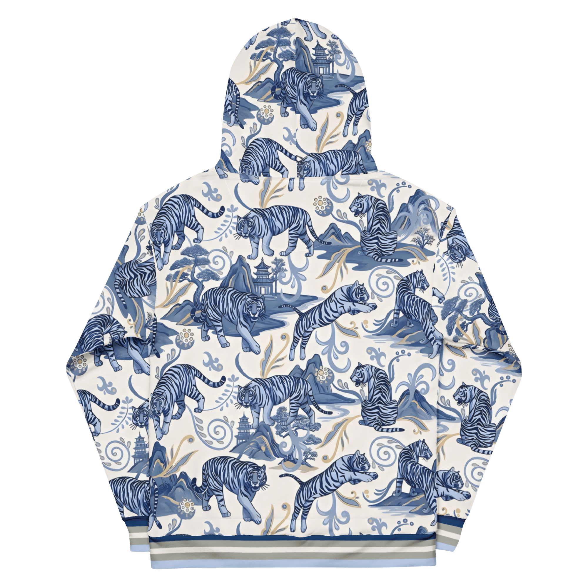 A wearable canvas of motion and mythology, this all-over print cotton hoodie features an elegant tapestry of blue tigers — whether leaping, prowling, or at rest in a dreamlike landscape. The palette blends soft ivory with deep indigo tones, creating a rich porcelain-inspired aesthetic that feels both timeless and modern. Swirling decorative motifs flow throughout the piece, complemented by subtle gold accents and scenes of pagodas and blooming flora, giving the garment the presence of fine art on fabric.