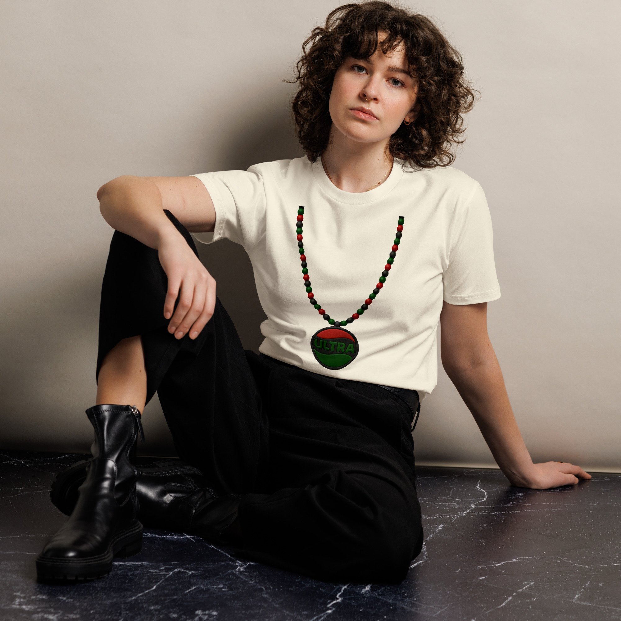 Channel bold heritage and hip-hop legacy with the Ultra Medallion Tee. Featuring a striking printed chain graphic in red, black, and green beads that drops into a circular medallion stamped with ULTRA, this shirt blends streetwear attitude with cultural pride. The crisp white cotton base makes the colors pop, while the minimalist fit keeps it modern and versatile.