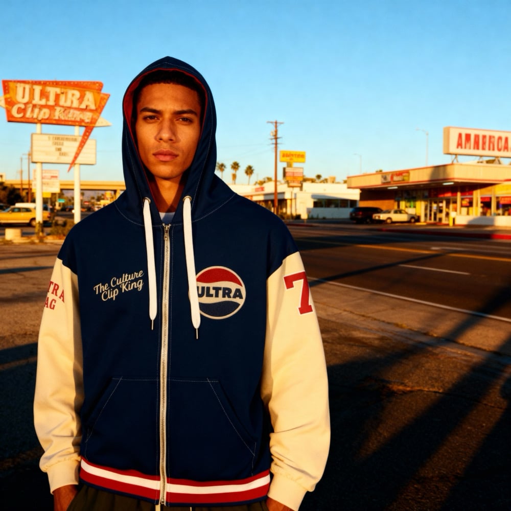 Crafted in deep navy with cream sleeves and a bold red-lined hood, this jacket merges streetwear attitude with refined detailing. The textured chenille “ULTRA” emblem across the back channels retro soda pop nostalgia, while the script “The Culture Clip King” embroidery celebrates UltraMag7’s signature creative energy. Red-and-white varsity striping along the hem nods to classic athletic wear, giving it that unmistakable old-school authenticity.